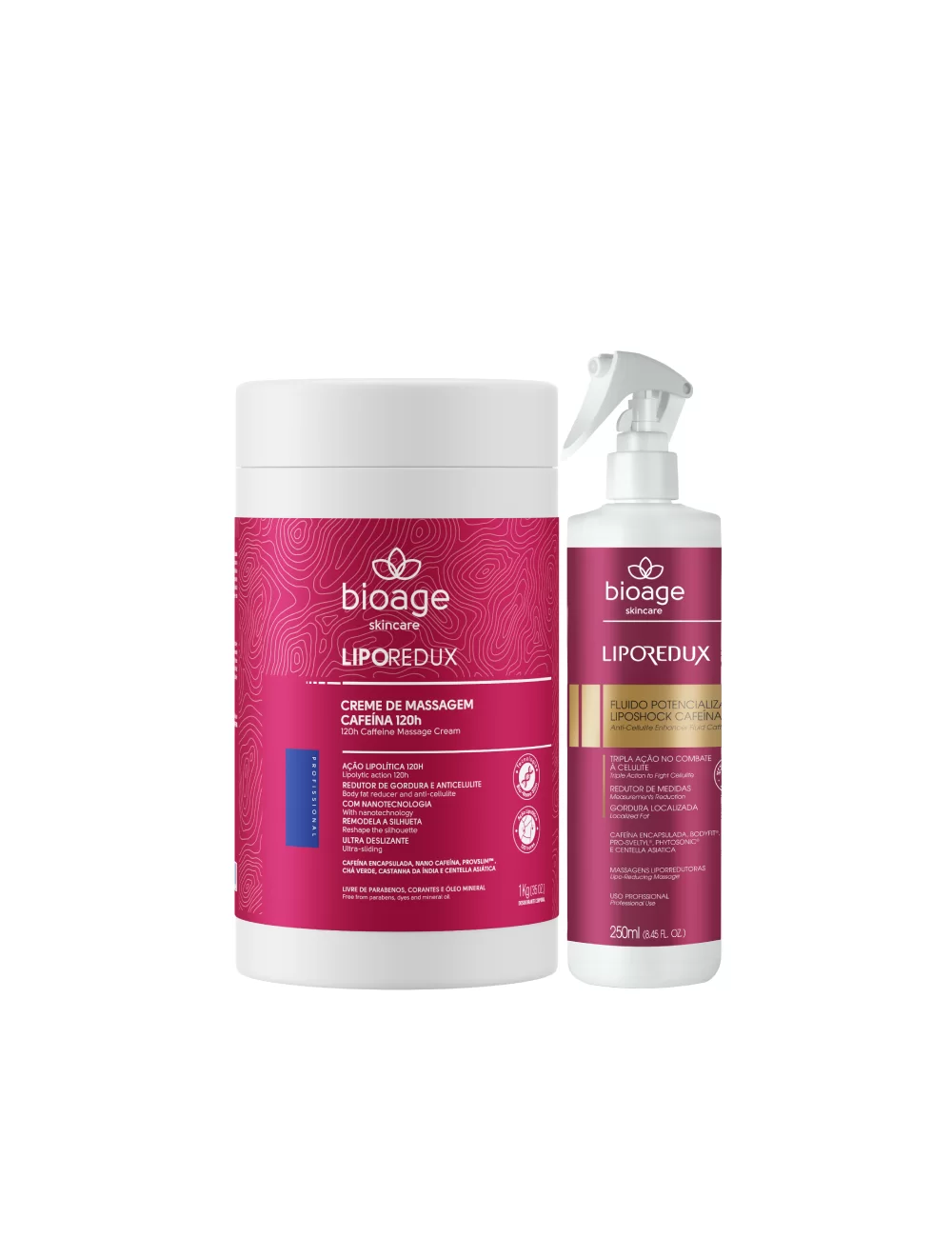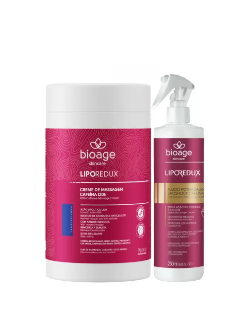 Basic kit for professional body treatments (shaping massage; reduction of measures) with the action of 24h / 120h Caffeine: Lipo Redux Fluído Liposhock (potentiating spray concentrated in reducing and anti-cellulite active ingredients) + Lipo Redux Creme de Massagem Cafeína 120h (reducing massage cream)